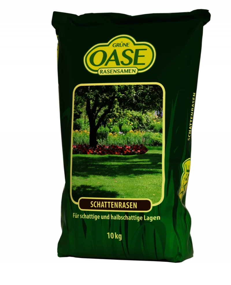 Gepflegte, robuste Schattenrasen-Mischung von Grüne Oase mit ausgesuchten Rasengräsern – ideal für halbschattigeflächen. Sie toleriert auch direkte Sonneneinstrahlung und eignet sich hervorragend für problematische Bereiche im Garten.