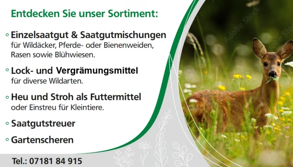Unser Sortiment steht für Vielfalt, Qualität und ökologische Verantwortung und bietet eine breite Palette von Produkten, die jede Anforderung im Bereich der nachhaltigen Land- und Forstwirtschaft, der Hege oder der Gartenpflege erfüllen. Von Heu und Stroh bis hin zu spezialisierten Produkten wie Wildackermischungen und Bienenmischungen – unser Sortiment ist sorgfältig zusammengestellt, um die Bedürfnisse von Tierhaltern, Naturliebhabern, Gärtnern, Land- und Forstwirten sowie Jägern zu erfüllen.