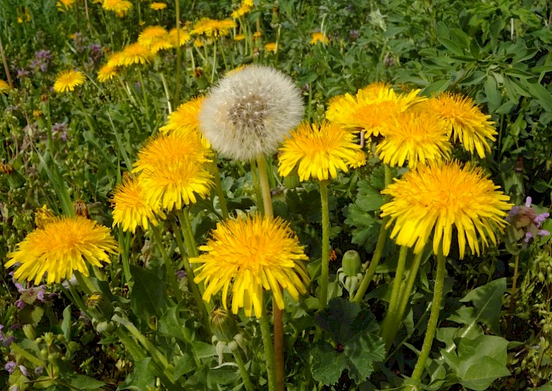 Der Gewöhnliche Löwenzahn (Taraxacum officinale) stellt eine Gruppe sehr ähnlicher und nah verwandter Pflanzenarten in der Gattung Löwenzahn aus der Familie der Korbblütler dar. Der Löwenzahn ist eine ausdauernde krautige Pflanze, die eine Wuchshöhe von 10 cm bis 30 cm erreicht und in allen Teilen einen weißen Milchsaft enthält. Seine bis zu 1 Meter (selten auch bis 2 Meter) lange, fleischige Pfahlwurzel ist außen dunkelbraun bis schwarz. Sie geht in eine kurze, stark gestauchte Sprossachse über, auf der die Blätter dicht in einer grundständigen Rosette stehen. Nach einer Verletzung des Vegetationspunktes regeneriert sich die Pflanze aus der Wurzel und bildet dann meist mehrere Blattrosetten. Durch das frühe Erscheinen seiner Blüten ist der Löwenzahn eine wichtige Bienenweide, die der Entwicklung der Bienenvölker im Frühjahr dient, bei größeren Vorkommen aber auch eine Frühtracht-Honigernte ermöglichen kann. Löwenzahn kommt in großen Mengen auf Grünland in der Landwirtschaft vor, welches stark gedüngt wurde mit Tiergülle, also auf Böden mit sehr viel Nitrat, den andere Pflanzen nicht vertragen.